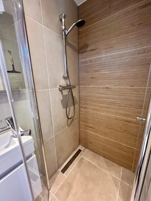 Salle de bain avec toilette, douche et chauffage central.