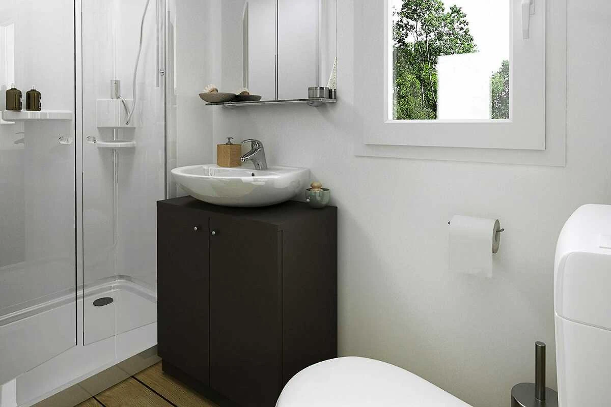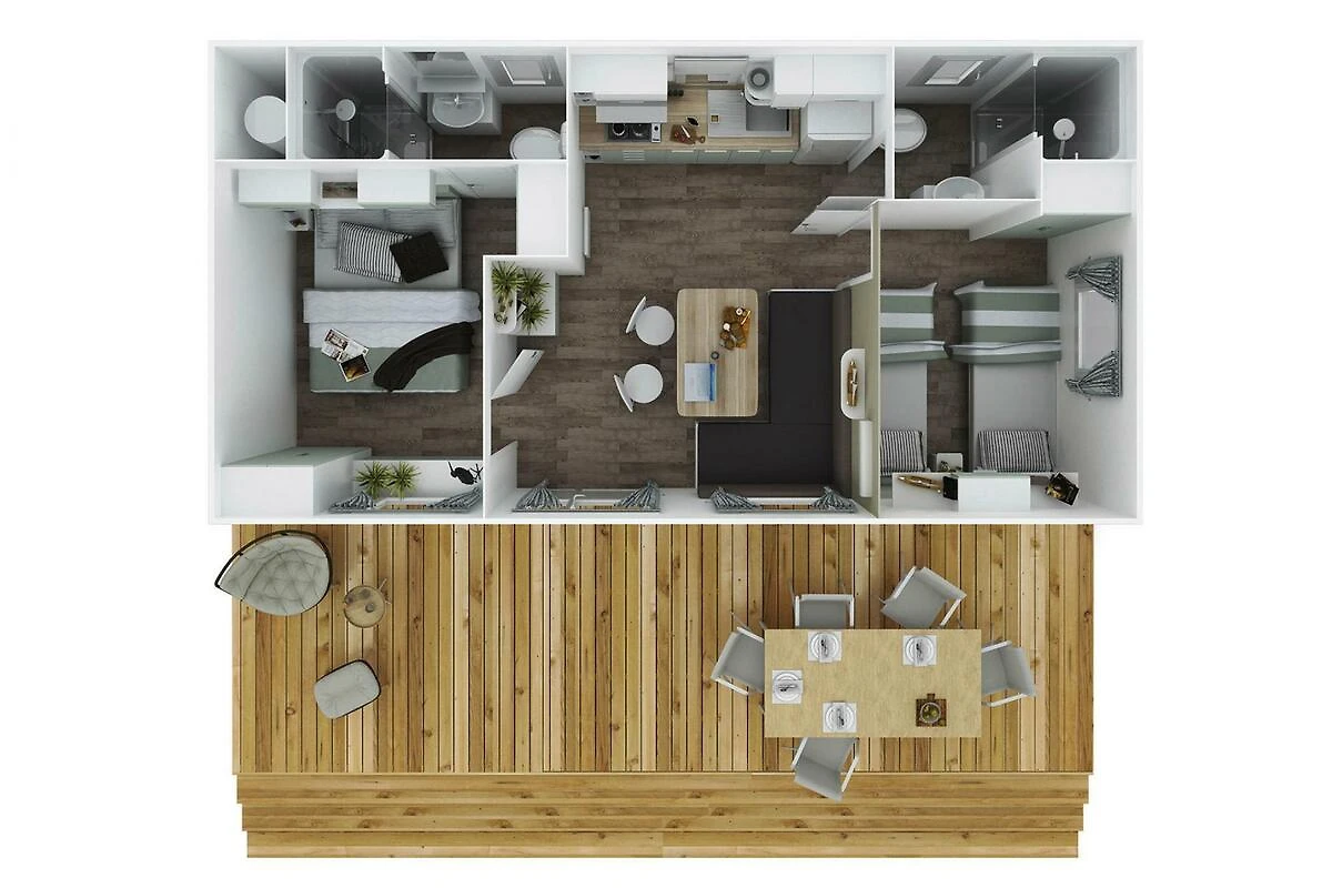 Rez-de-chaussée: (Salle de séjour(lit gigogne simple, TV(satellite)), cuisine ouverte(table, foyer(4 foyers, gaz), combinaison réfrigérateur/congélateur), chambre(lit double), chambre(2x lit simple, Lit superposé), salle de bains(douche, WC), salle de bains(douche, WC), climatisation, terrasse, mobilier de jardin)