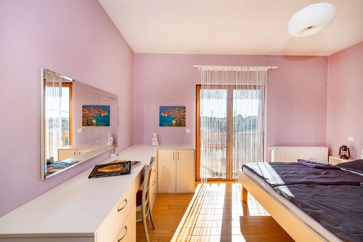 Nous avons passé de merveilleuses vacances avec cinq personnes. Les propriétaires sont des gens très accueillants avec une belle maison dans un petit village tranquille à environ 7 km de la mer. L'appartement au premier étage est assez grand et entièrement équipé, avec un beau coucher de soleil tous les soirs. Nous avons été bien accueillis et avec des questions et des souhaits, nous pouvions toujours passer en bas. De plus, nous sommes surchargés de légumes frais et de fruits de leur propre jardin.L'endroit est merveilleusement paisible et rural. Nous ne pouvons que recommander chaleureusement la maison et les gens.