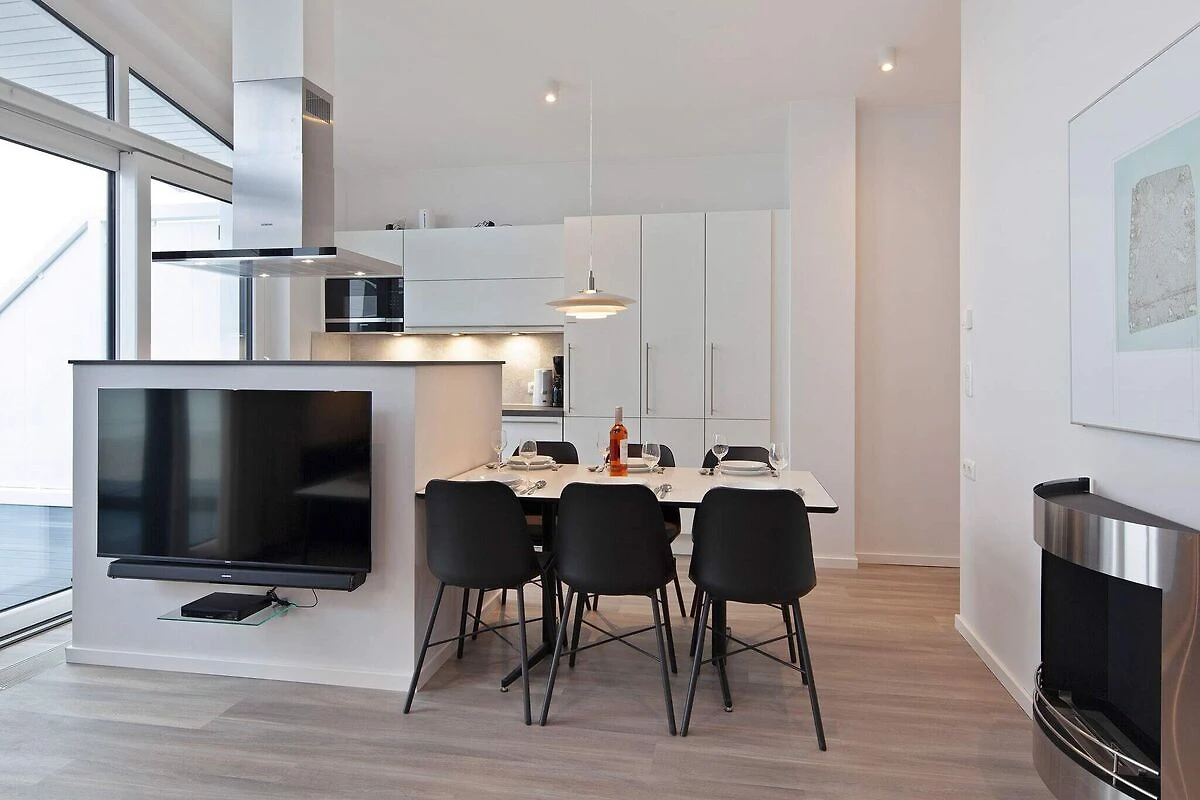Die moderne Wohnung besticht durch eine großzügige Dachterrasse mit unvergleichlichem Panoramablick über das Meer und den idyllischen Ostseehafen. Hier erleben Sie maritimes Flair aus der ersten Reihe! Im Inneren erwartet Sie ein stilvoll eingerichteter, offener Wohn- und Küchenbereich mit Zugang zur großen Dachterrasse. Die hochwertige Küche ist mit einem Herd und einem WOK-Kochfeld ausgestattet. Zwei gemütliche Schlafzimmer bieten jeweils ein bequemes Doppelbett und einen eigenen Flachbildfernseher. Zwei weitere Schlafplätze finden auf dem bequemen Schlafsofa im Wohnzimmer Platz. Das moderne Badezimmer mit Regendusche, Dampfbadfunktion und Fußbodenheizung sorgt für besonderen Komfort. Zur Ausstattung gehören außerdem ein Fernseher mit Blu-Ray-Player, eine Bluetooth-fähige Soundbar und ein gemütlicher Bioethanol-Kamin für entspannte Abende. Die großzügige Dachterrasse ist perfekt ausgestattet: Ein großer Tisch mit sechs Stühlen und zwei bequeme Liegen laden zum Sonnenbaden, Essen und Entspannen im Freien ein. Die Wohnung ist bequem mit dem Aufzug erreichbar und verfügt über einen eigenen Parkplatz. Internet per Glasfaseranschluss sorgt für blitzschnelles Surfen.