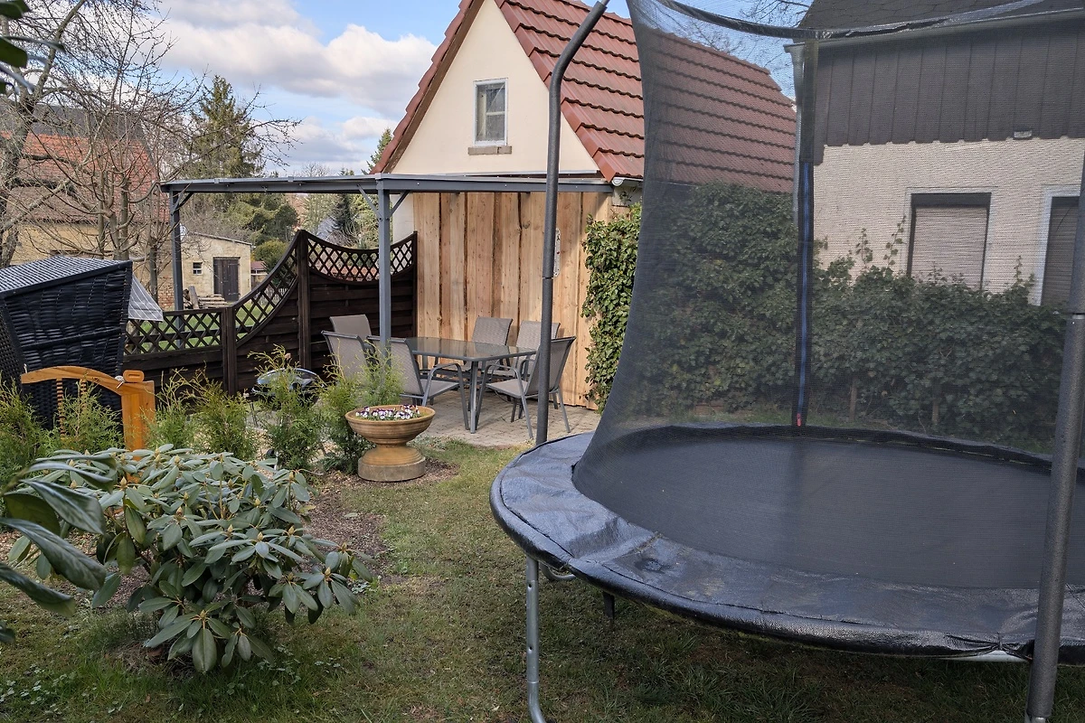 Le jardin avec coin salon, barbecue, chaise longue et fauteuil de plage se trouve à la maison de vacances. Pour les enfants, il y a un trampoline.