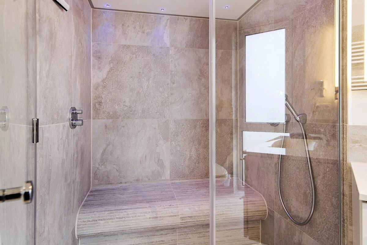 , cuisine ouverte(plaque de cuisson(électrique), hotte, cafetière/percolateur, micro ondes, lave-vaisselle , réfrigérateur(+ congélateur)), living/chambre à coucher(lit double pliant, TV(cable, chaînes de télévision allemandes), Lecteur Blu-ray, radio, Lecteur CD, installation stéréo, cheminée à gaz), chambre(lit double), chambre(lit double), salle de bains(chauffage par le sol)(Hammam, lavabo, douche, WC), combinaison réfrigérateur/congélateur, balcon ou terrasse(27 m2)