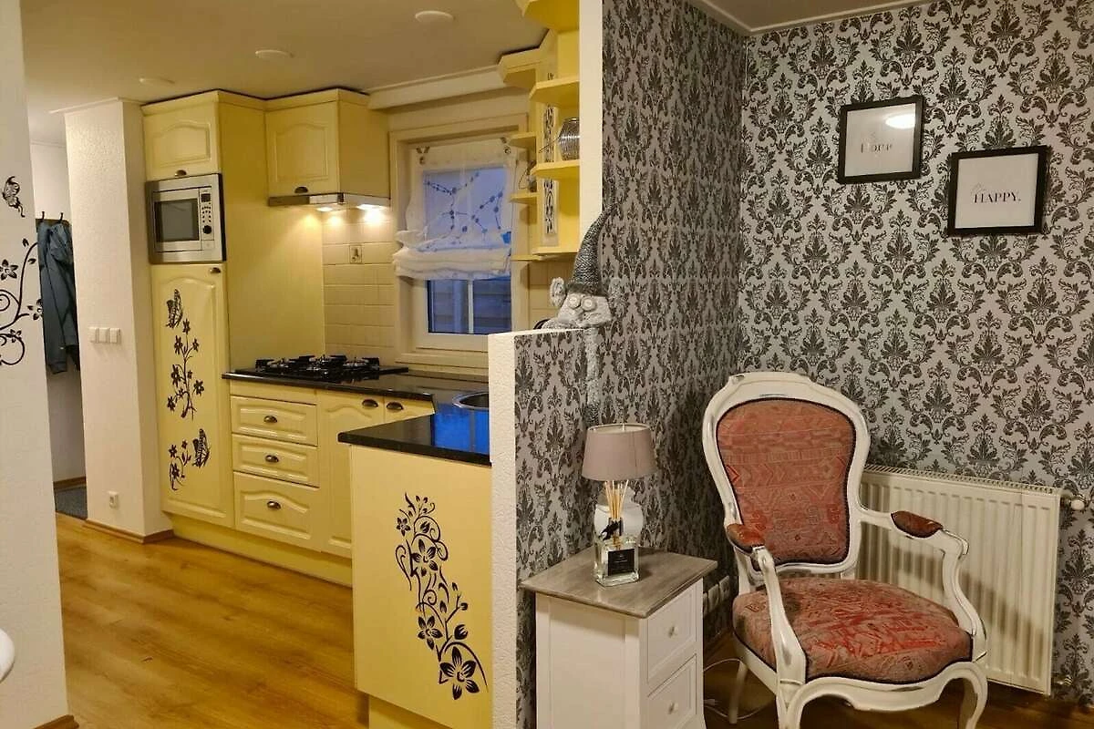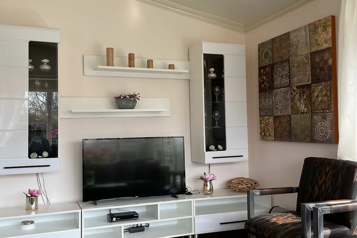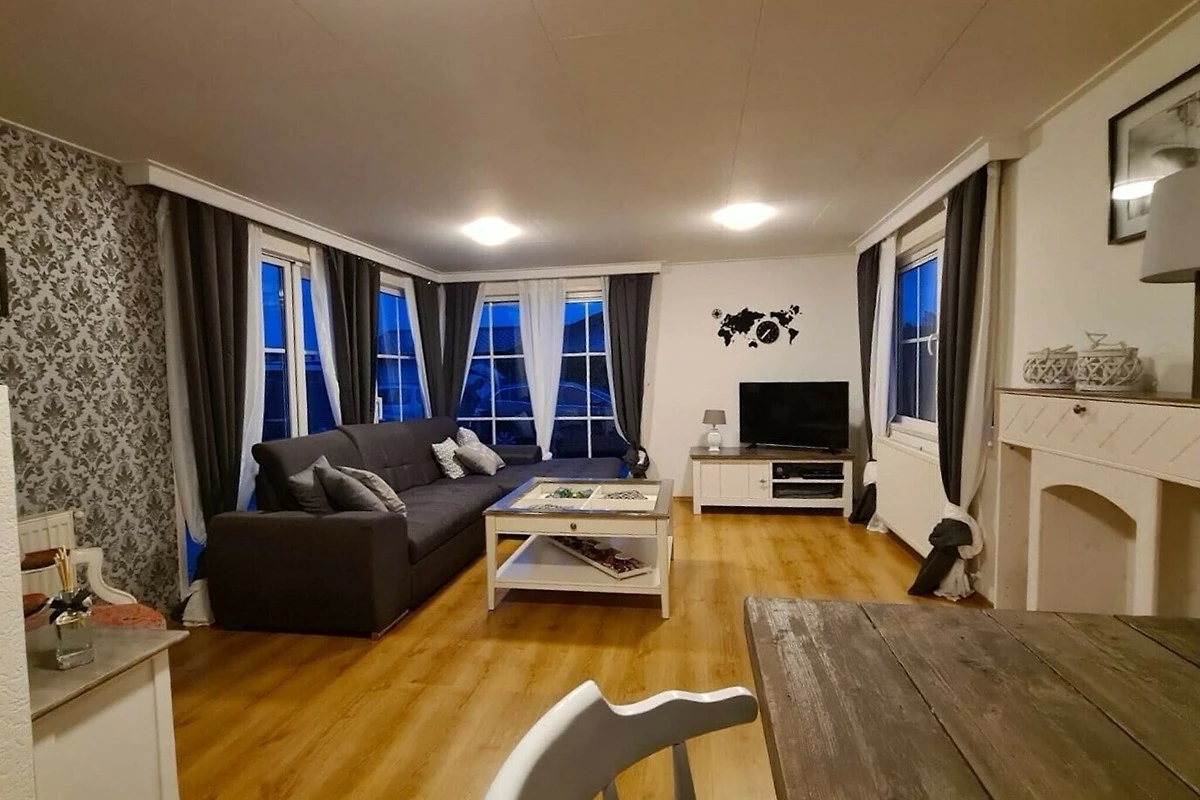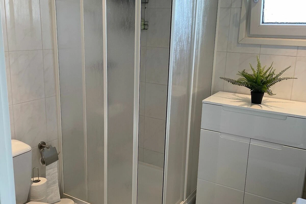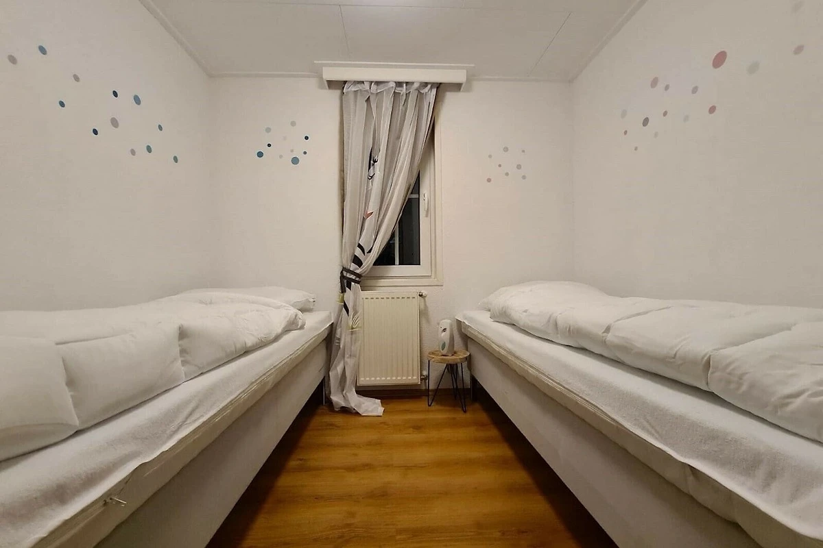 Rez-de-chaussée: (Salle de séjour(TV), cuisine ouverte(bouilloire, plaque de cuisson, cafetière/percolateur, lave-vaisselle , réfrigérateur(+ congélateur)), chambre(lit double), chambre(lit simple, lit simple), salle de bains(douche, lavabo, WC))