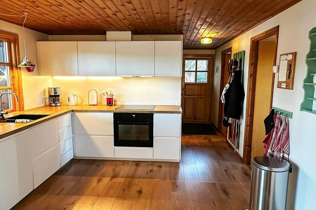 , cuisine(poêle(induction), cafetière/percolateur, lave-vaisselle , combinaison réfrigérateur/congélateur), living/chambre à coucher(TV), chambre(lit double), chambre(2x lit simple), salle de bains(lavabo, douche, WC, lave-linge ), garage, sauna(dans la maison, 4 personnes), chauffage(électrique), terrasse, mobilier de jardin, chaises longues, cages de football, pompe à chaleur air/air