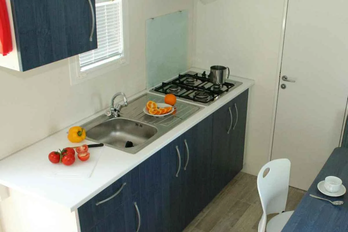 Votre Mobilehome: Votre maison mobile a 1 étage, 3 chambres (dont 2 chambres à coucher), est de 24 m² et convenable pour un maximum de 5 personnes. Il est interdit de fumer à l'intérieur. Un air conditionné assure une température agréable pendant les journées chaudes. L'entrée mène directement dans le salon/chambre à coucher. Les chambres sont réparties comme suit: chambre à coucher avec 2 lits simples et (adapté moins de 11 ans). chambre à coucher avec 1 lit double. salon avec 1 lit supplémentaire, coin repas et Espace de couchage supplémentaire dans le salon, représenté par le siège avec coussins autour de la table à manger. Le coin repas offert des places pour 6 personnes. Vous avez accès à la terrasse avec des meubles de jardin. coin cuisine avec cuisinière à gaz (4 flammes) et frigo (congélateur). salle de bain avec douche, 1 lavabo 1 lavabos et WC.