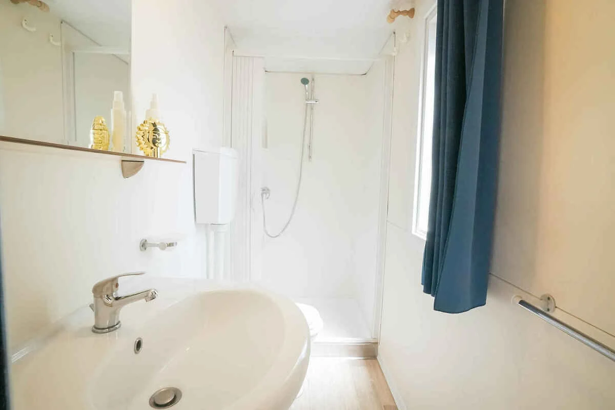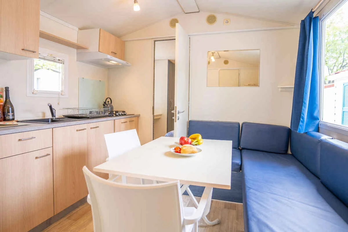Votre Mobilehome: Votre maison mobile a 1 étage, 3 chambres (dont 2 chambres à coucher), est de 24 m² et convenable pour un maximum de 5 personnes. Il est interdit de fumer à l'intérieur. Un air conditionné assure une température agréable pendant les journées chaudes. L'entrée mène directement dans le salon/chambre à coucher. Les chambres sont réparties comme suit: chambre à coucher avec 2 lits simples et (adapté moins de 11 ans). chambre à coucher avec 1 lit double. salon avec 1 lit supplémentaire, coin repas et Espace de couchage supplémentaire dans le salon, représenté par le siège avec coussins autour de la table à manger. Le coin repas offert des places pour 6 personnes. Vous avez accès à la terrasse avec des meubles de jardin. coin cuisine avec cuisinière à gaz (4 flammes) et frigo (congélateur). salle de bain avec douche, 1 lavabo 1 lavabos et WC.