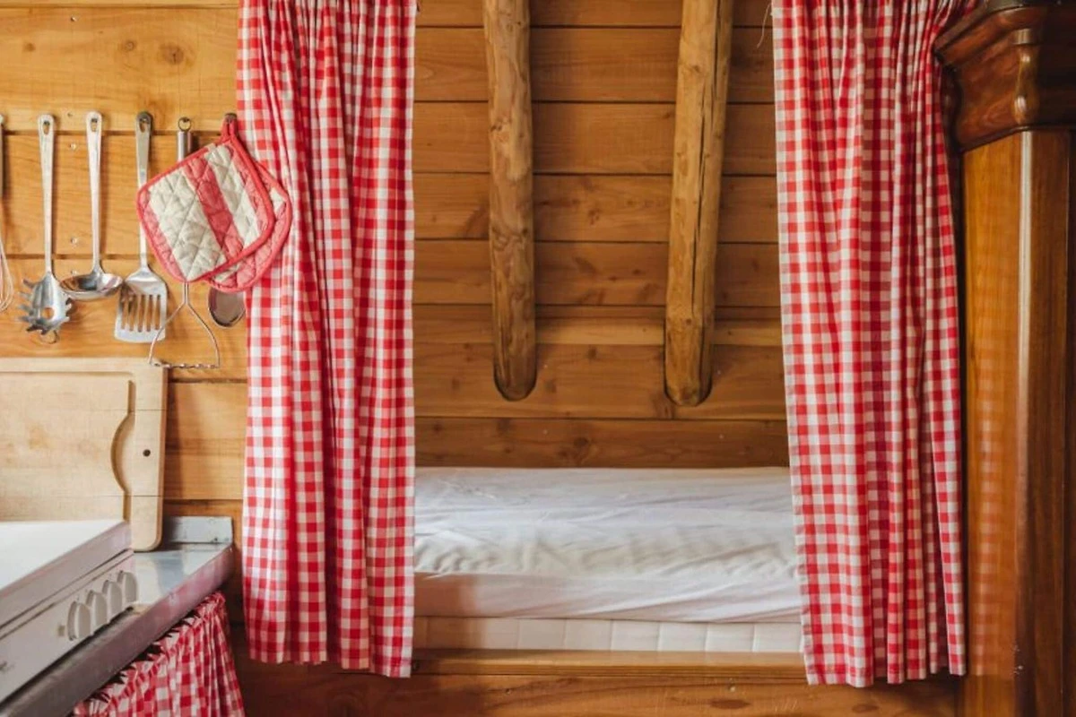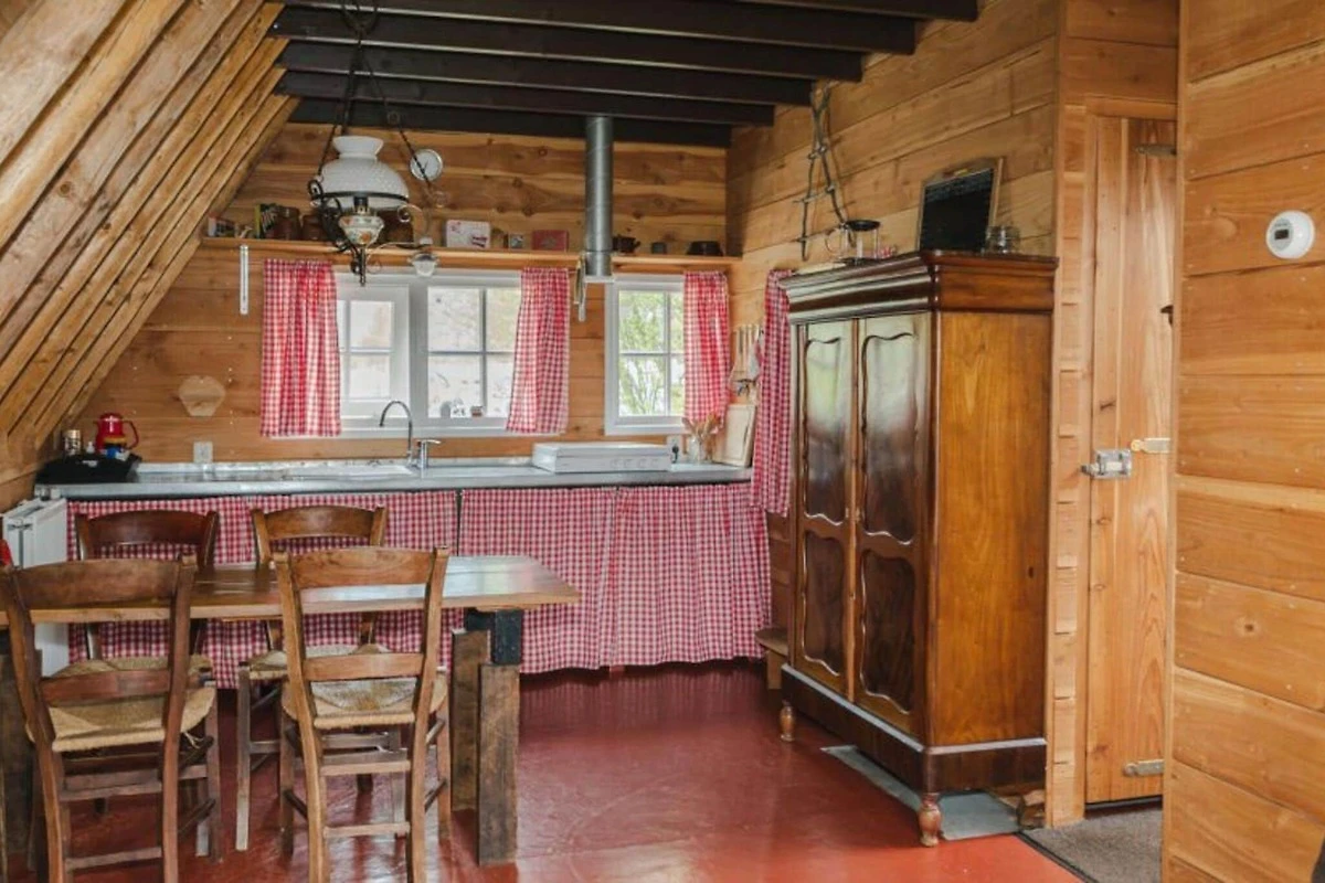 Rez-de-chaussée: (Salle de séjour(canapé-lit double, TV, table, coin salon), cuisine ouverte(foyer(4 foyers, gaz), bouilloire, cafetière/percolateur, four/micro-onde combinés, réfrigérateur), chambre(lit clos double), salle de bains(douche, lavabo, WC))