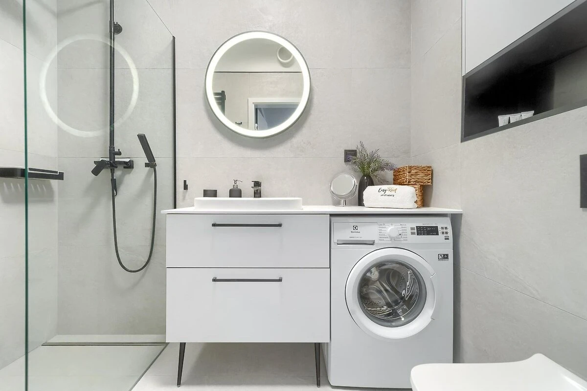 Appartement spacieux et confortable au rez-de-chaussée. Il se compose d'un séjour relié à la cuisine, d'une chambre et d'une salle de bain avec douche (il y a aussi un lave-linge). Le salon dispose d'un canapé-lit double, d'une table avec chaises et d'une télévision. Il y a un lit double dans la chambre. La cuisine est parfaitement équipée (comprenant four, cuisinière 4 feux, micro-ondes, lave-vaisselle). L'appartement dispose d'une terrasse couverte avec un ensemble de mobilier de salon et d'un petit bout de jardin privatif où vous pourrez vous allonger sur un transat. Chauffage central. Internet sans fil est disponible. Également équipé d'un fer et d'une planche à repasser. Un parking gratuit est disponible sur place.