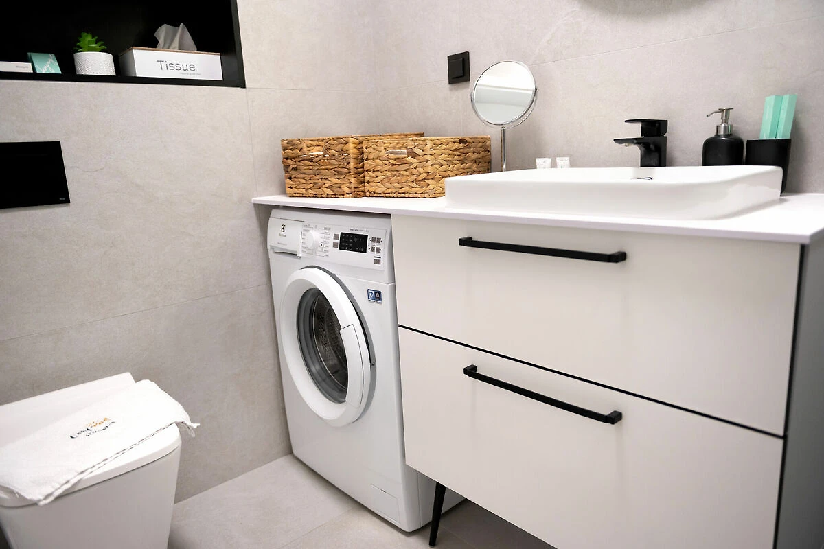 Rez-de-chaussée: (cuisine ouverte(foyer(4 foyers, induction), bouilloire, grille-pain, hotte, cafetière/percolateur, four, micro ondes, lave-vaisselle , combinaison réfrigérateur/congélateur), salle à manger-salon(canapé-lit double, TV(écran plat), table(4 personnes)), chambre(lit double), salle de bains(douche, lavabo, WC, lave-linge , sèche-cheveux))