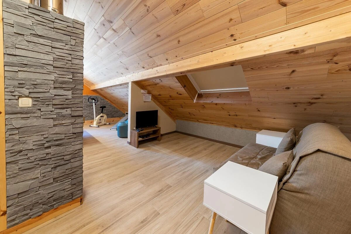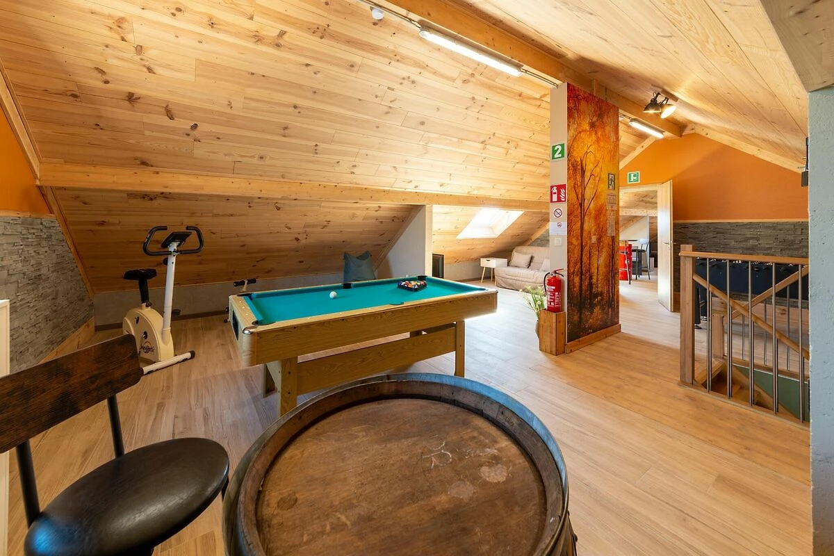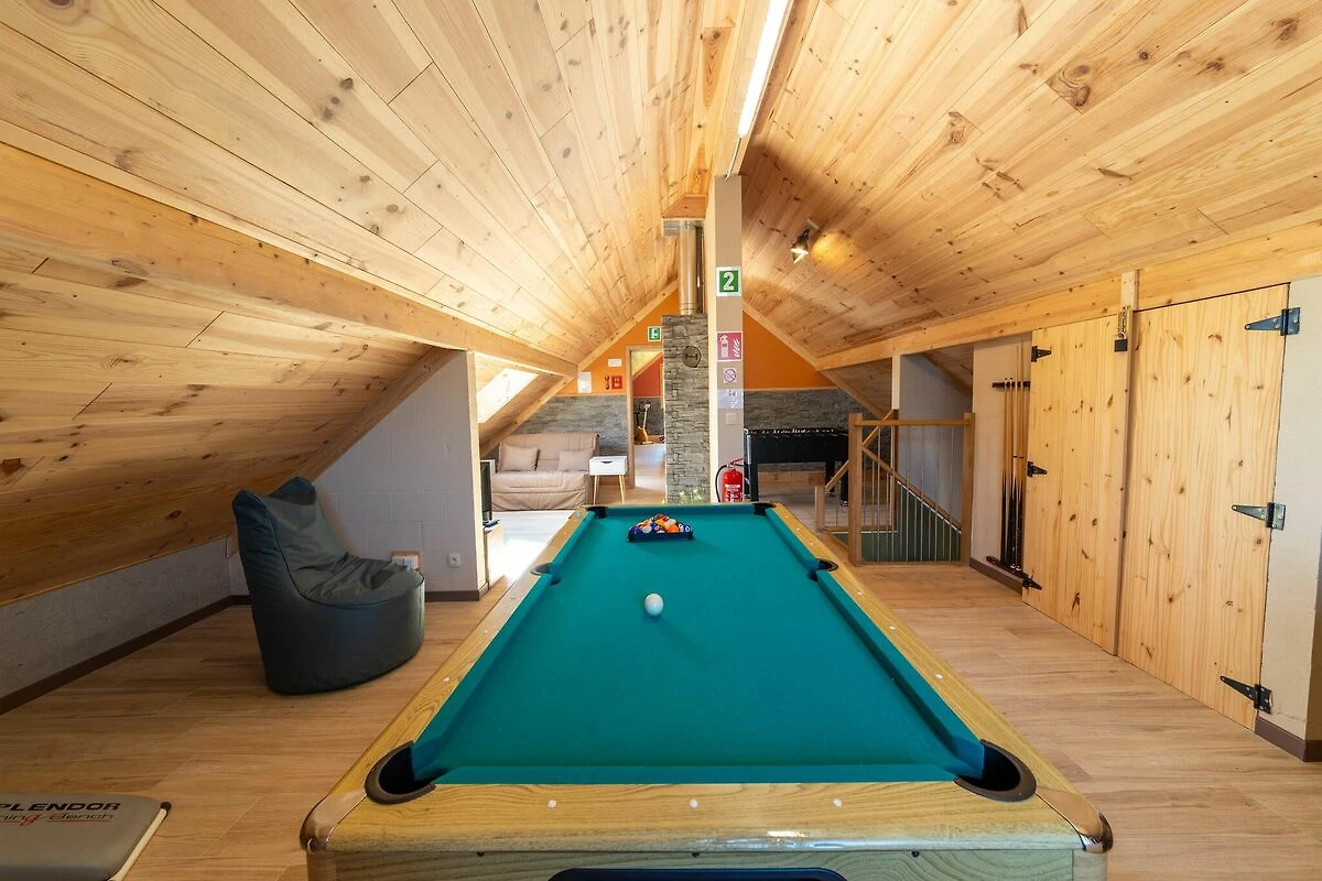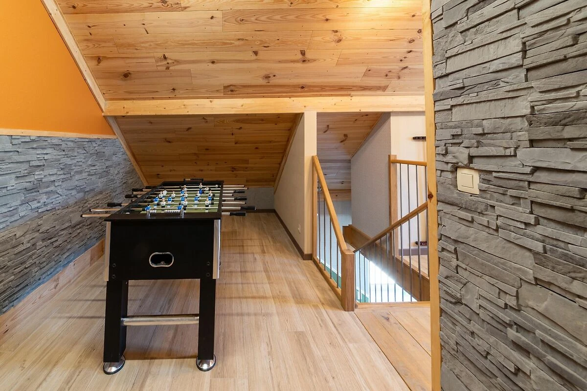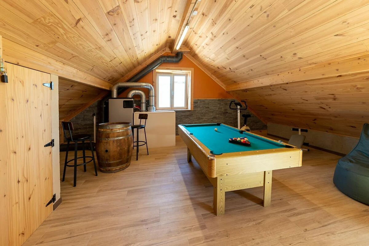 À l'intérieur, la maison offre une cuisine bien équipée, des chambres confortables et une salle de jeux au deuxième étage avec billard, baby-foot et jouets, pour le plaisir de tous les âges. Les couchages modulables permettent de joindre ou de séparer les lits simples, ce qui en fait un hébergement idéal pour les couples ou les amis. Le Wi-Fi gratuit, la télévision et le parking sur place sont inclus.