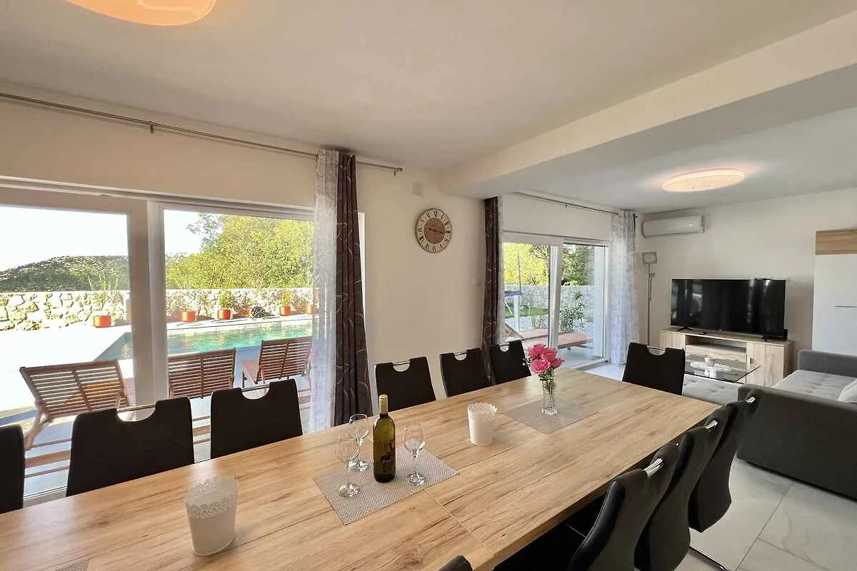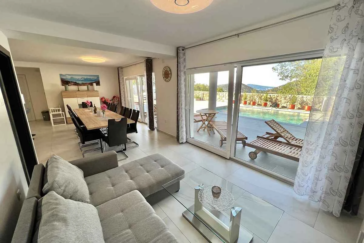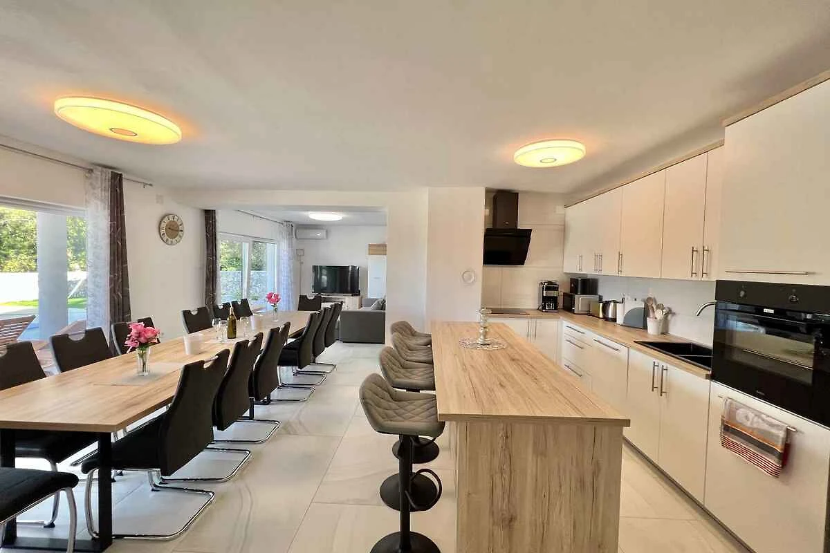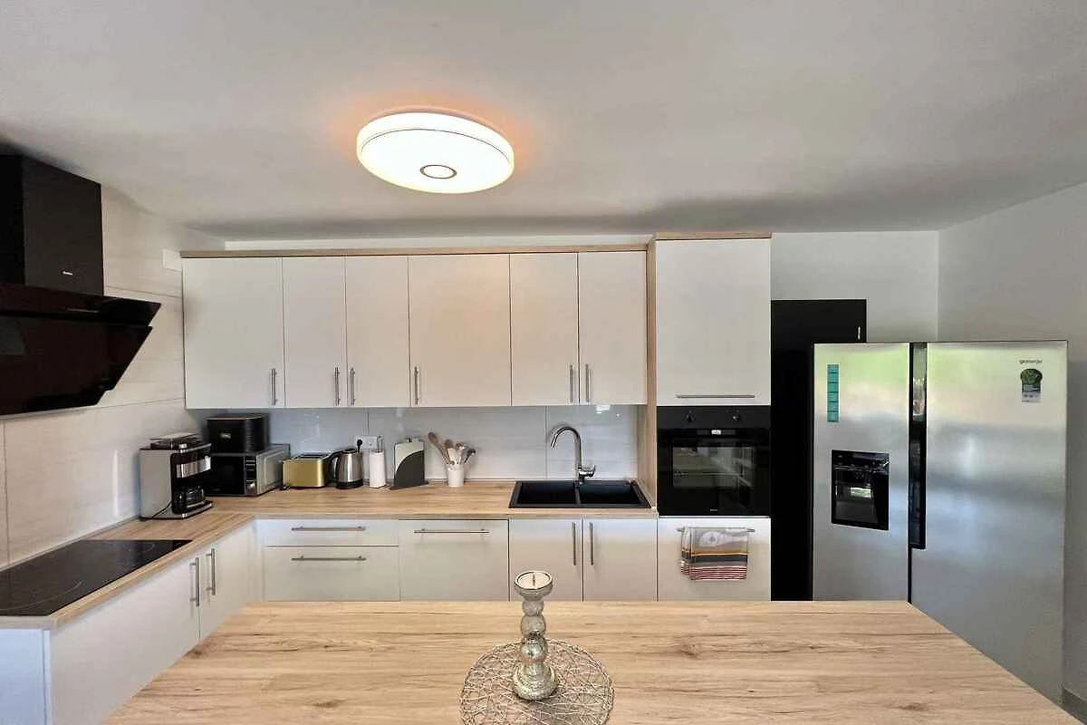 Localisation: Bribir. La villa isolée et rénovée en 2023 est moderne et luxueuse. Le terrain se trouve dans une résidence à la périphérie. Aussi pour la vue sur la vallée et l' emplacement tranquille et ensoleillé est populaire la domicile. L´accès à la propriété se fait par une route principale asphaltée. À la villa sont disponibles pour vous 4 places de stationnement sur le terrain. À la distance de 500 m est la possibilité d'achats la plus proche, restaurant 500 m et centre-ville 500 m. discothèque, médecin, pharmacie, banque respectivement 5 km à Crickvenica. fleuve: gare 30 km et cinéma, aéroport respectivement 35 km.