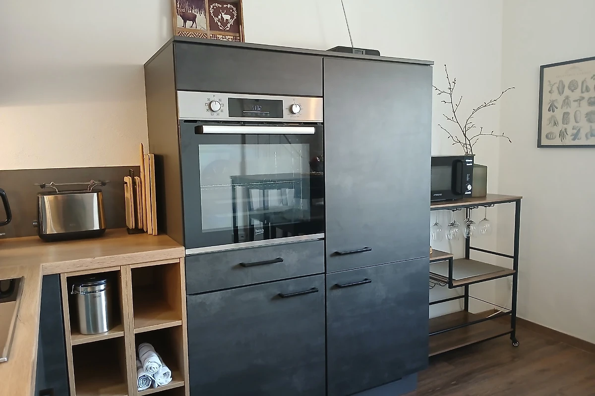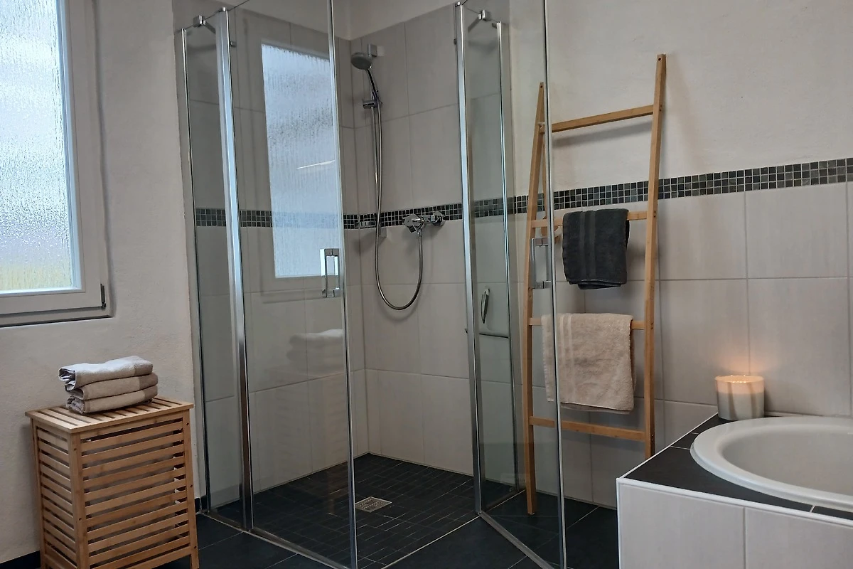 • RDC : Ici, notre cuisine-séjour avec four, micro-ondes, etc. vous accueille chaleureusement. Au bar avec quatre tabourets, vous pouvez discuter avec le cuisinier pendant qu’il prépare les plats pour vos proches. Le centre de l’hospitalité est le séjour confortable avec poêle à pellets chaleureux, canapé-lit extensible pour 2 personnes, Smart-TV et buffet haut. Autour de la grande table à manger, vous pourrez revivre ensemble les impressions de la journée de vacances. De plus, vous trouverez des jeux et des livres pour votre divertissement. La salle de bain spacieuse avec douche à l’italienne, baignoire, WC et bidet invite à la détente. • Étage supérieur : À cet étage se trouvent les chambres à coucher, toutes trois équipées de lits doubles avec matelas séparés et aménagées avec beaucoup d’attention aux détails, dont l’une avec TV satellite. Une deuxième salle de bain avec douche, lavabo et WC complète les pièces à cet étage.