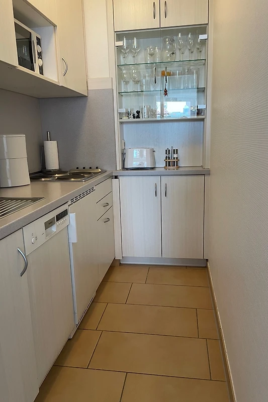 L'appartement est décoré dans un style maritime et l'équipement est comme neuf. La plus grande chambre dispose d'un lit double français (1,40 m de large) et d'un lit simple. La deuxième chambre est équipée de lits superposés et d'une grande armoire. Dans la cuisine moderne intégrée, vous trouverez tout l'équipement nécessaire. Au sous-sol, il y a une lave-linge et un sèche-linge fonctionnant avec des pièces de monnaie. Un emplacement pour vélos, ainsi qu'un abri à vélos couvert sont également disponibles.