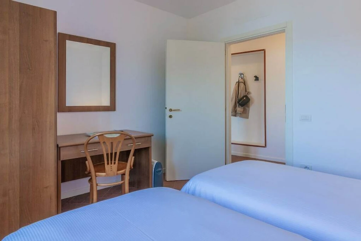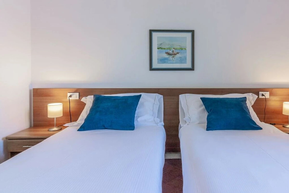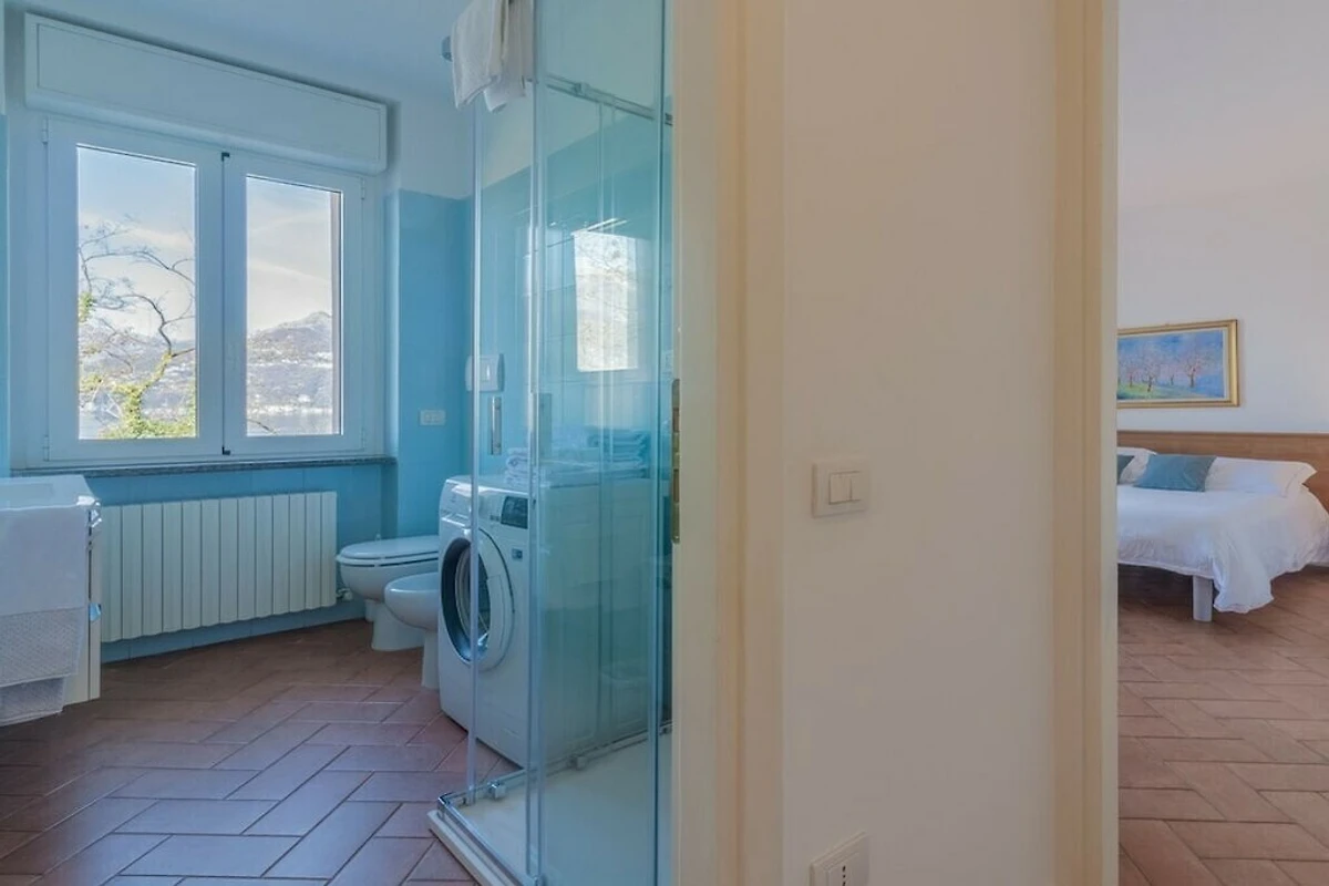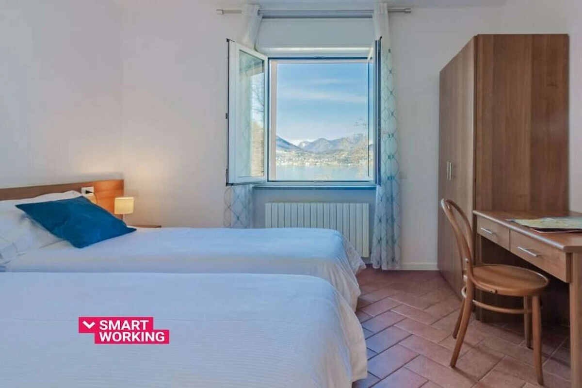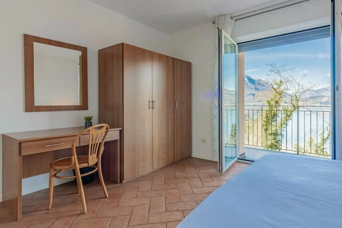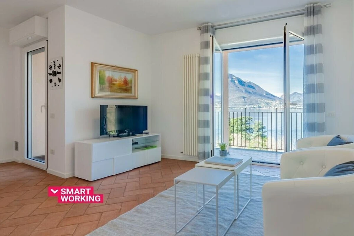 L'appartement est situé au rez-de-chaussée et dispose d'un salon lumineux et ouvert avec accès au balcon avec vue sur le lac et est meublé de fauteuils, table basse, télévision, table à manger et d'une cuisine entièrement équipée avec four, lave-vaisselle, micro-ondes, bouilloire. , presse-agrumes et grille-pain. L'espace nuit se compose de deux chambres vue lac, toutes deux avec bureau et armoire, l'une avec un lit double et l'autre avec deux lits simples. La chambre principale a également accès au balcon. Une salle de bain avec douche complète les équipements.