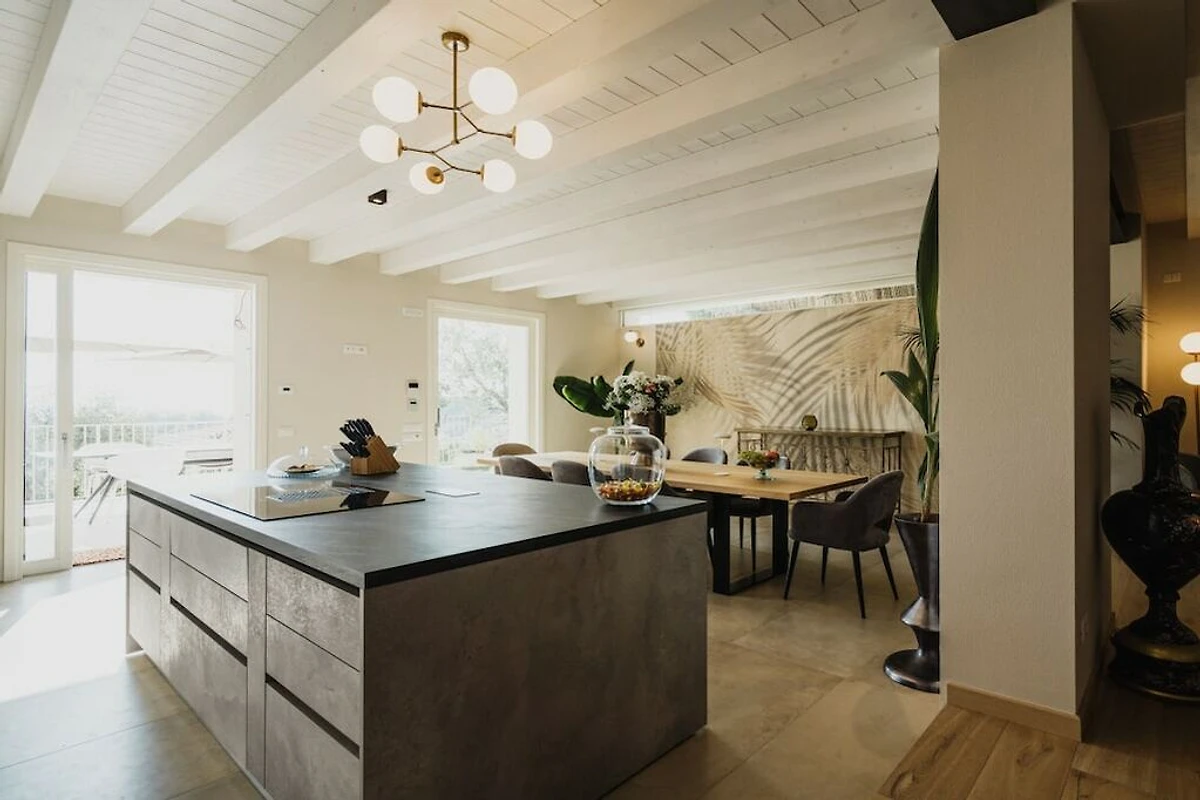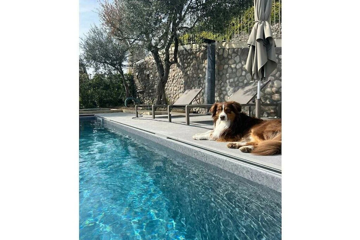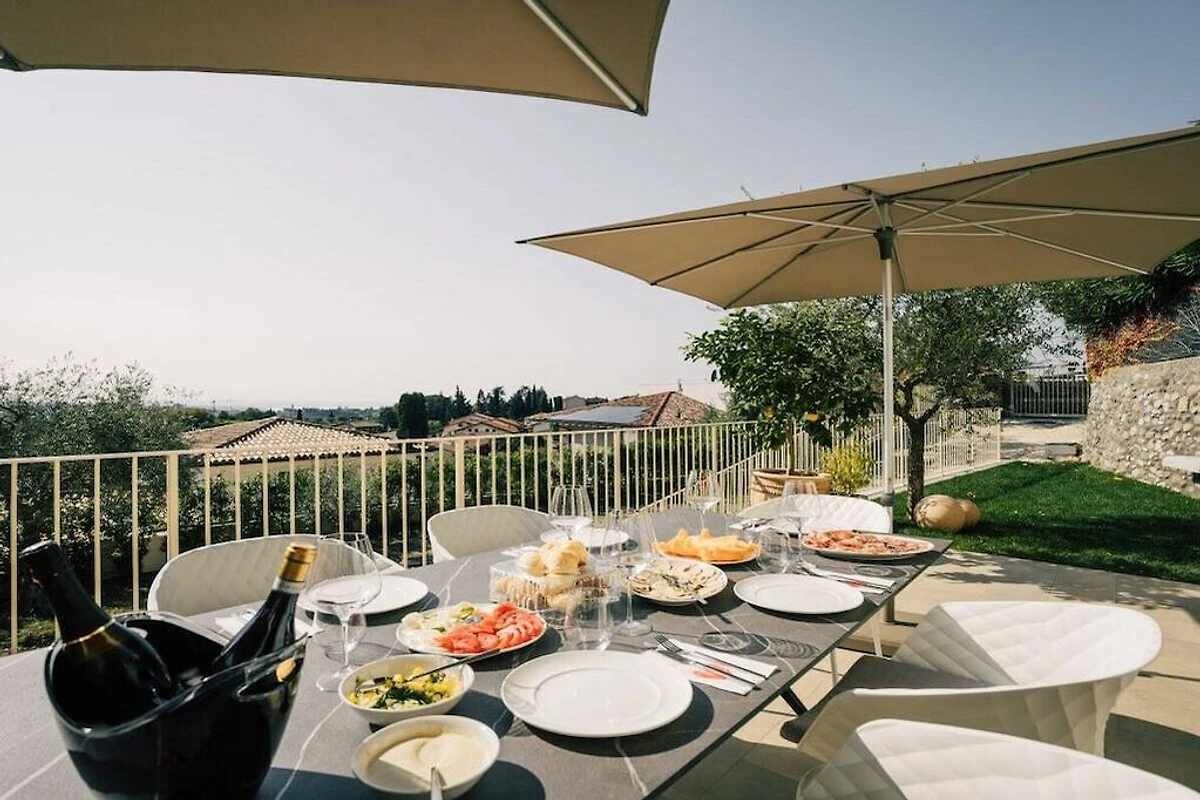 La maison moderne dispose de trois chambres, trois salles de bains, une cuisine ouverte et de haute qualité, un salon spacieux, deux terrasses avec une vue unique sur le lac de Garde, une grande piscine chauffée et un garage.
