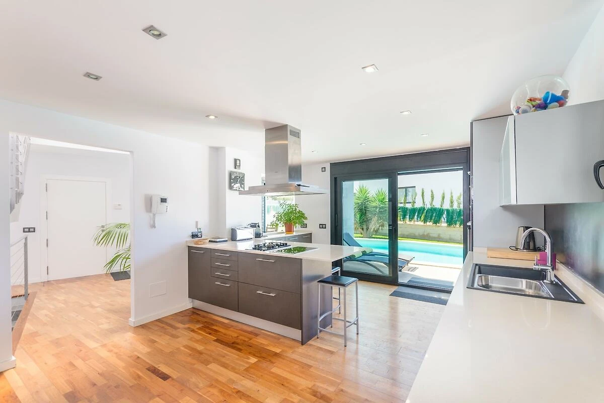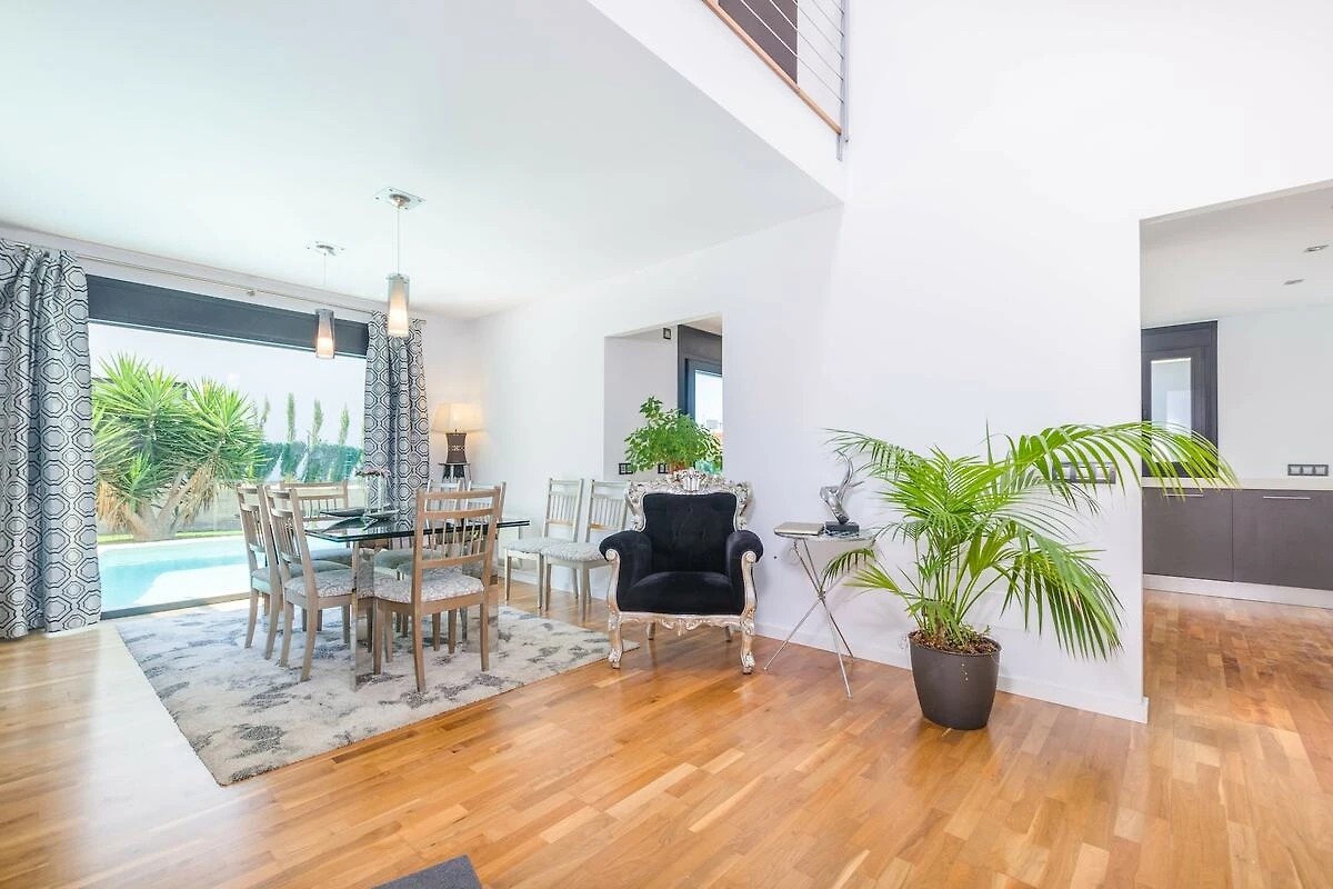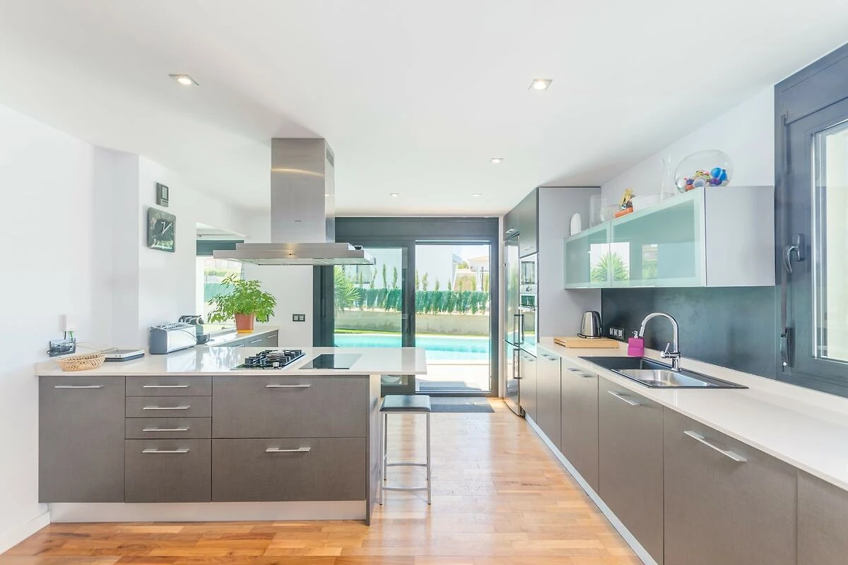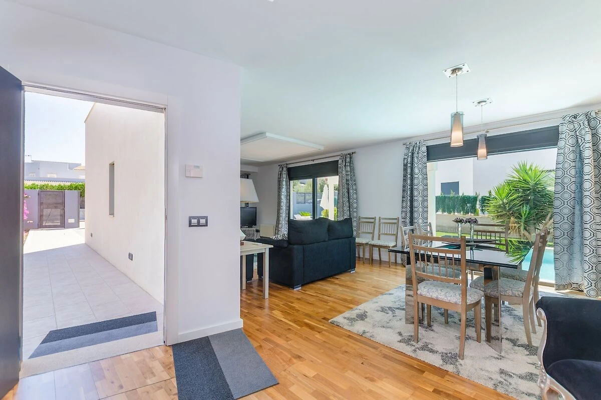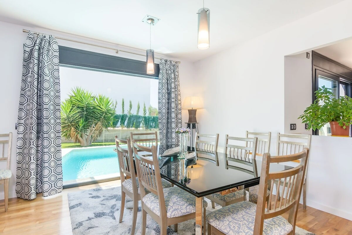 Salle de séjour, salle à manger, cuisine(cafetière/percolateur, four), chambre(lit double), chambre(lit double), chambre(lit double), salle de bains, salle de bains, salle de bains, plaque de cuisson, micro ondes, lave-vaisselle , combinaison réfrigérateur/congélateur, douche, douche, lavabo, lavabo, lavabo, WC, WC, WC, bidet, climatisation, climatisation, climatisation, jardin, mobilier de jardin, 6x transats, barbecue, 4x parasol, piscine, lit d'enfant, chaise haute