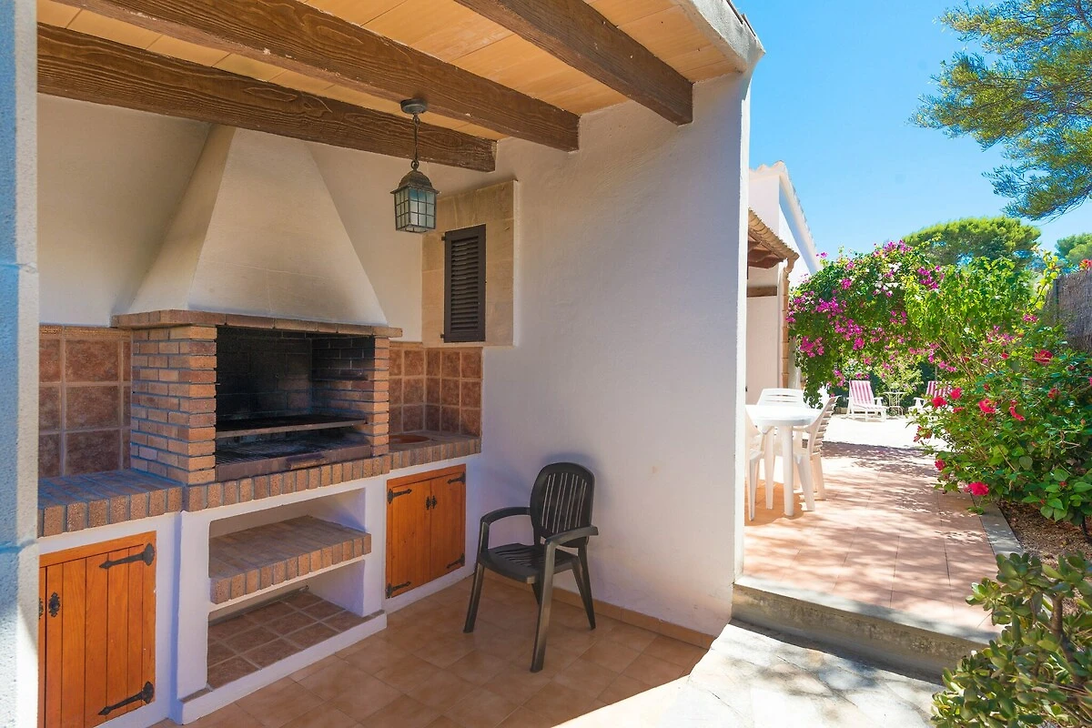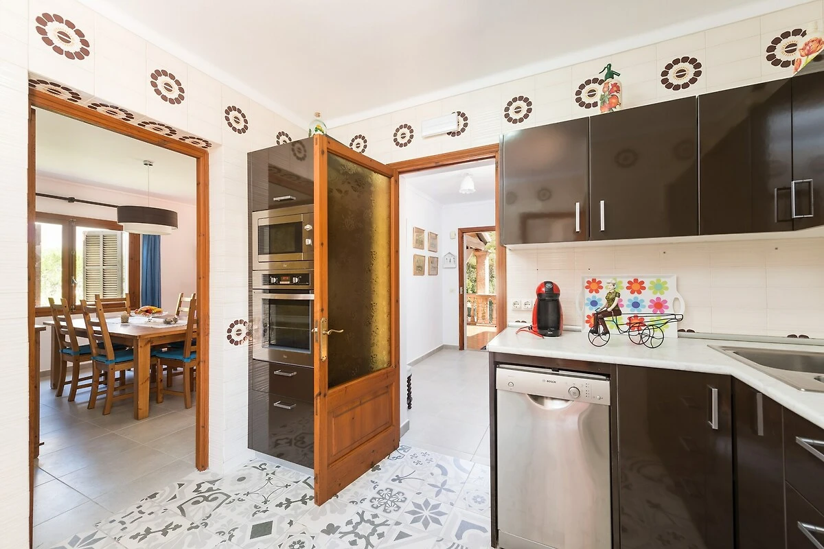 À l'intérieur, vous trouverez une salle à manger lumineuse avec télévision par satellite, climatisation et poêle à bois. La cuisine est récemment rénovée, avec une plaque de cuisson vitrocéramique. La maison offre trois chambres avec placards : une avec un lit double et deux avec deux lits simples. Il y a deux salles de bains, l'une avec une baignoire et l'autre avec une douche. La salle à manger et le couloir sont climatisés, et si vous visitez en hiver, jusqu'à trois radiateurs seront fournis. Un lit bébé et une chaise haute sont disponibles pour les familles voyageant avec un bébé. Vous trouverez également une machine à laver, un fer et une planche à repasser dans le garage.