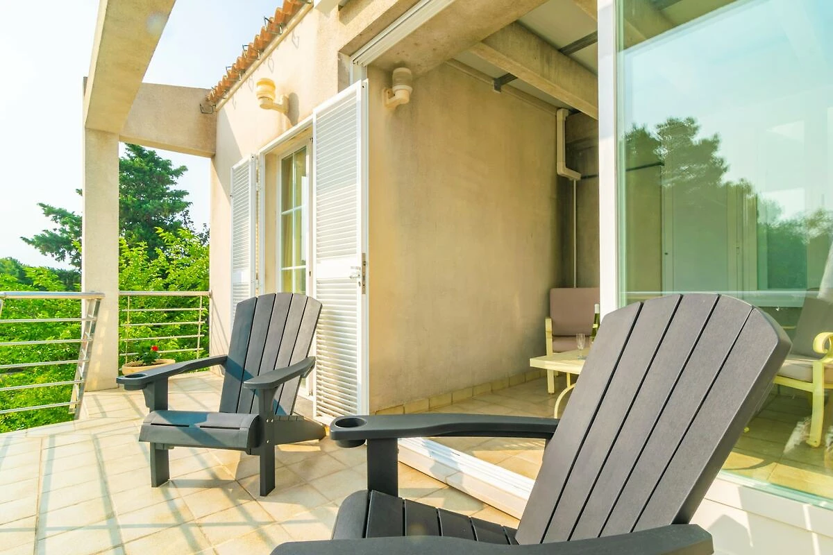 À l'intérieur, la maison sur deux niveaux comprend un salon chaleureux avec télévision, un coin repas et une cuisine au gaz avec accès direct au jardin. Le rez-de-chaussée comprend deux chambres, l'une avec des lits jumeaux, l'autre avec un lit simple, et une salle de bain avec baignoire. À l'étage, la chambre principale dispose d'un lit double, d'une salle de bain attenante et d'un accès à une terrasse ensoleillée avec chaises longues. Un petit salon offre un coin paisible pour lire ou discuter. Toutes les chambres sont climatisées et des articles de toilette pour bébé sont disponibles.