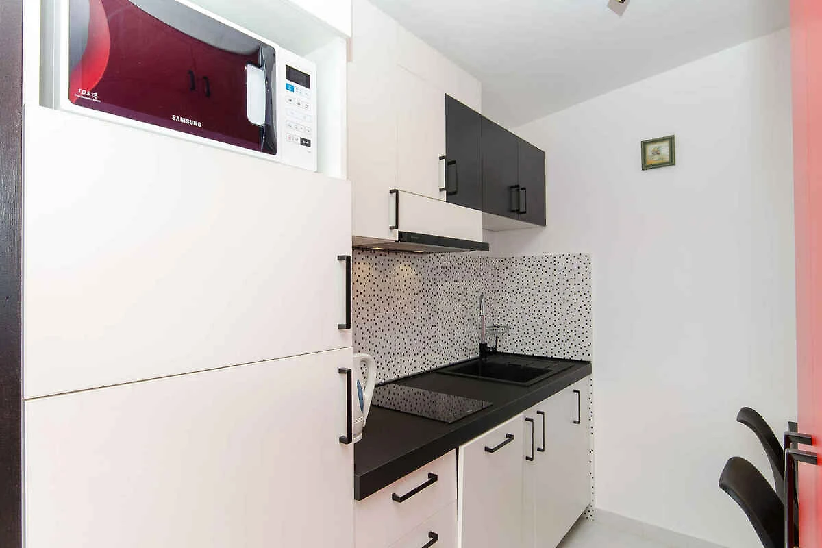Votre appartement de vacances: Votre appartement de vacances a 1 étage, 2 chambres (dont 1 chambre à coucher), est de 38 m² et convenable pour un maximum de 2 personnes. Un air conditionné assure une température agréable pendant les journées chaudes. Pendant les journées plus froides, votre appartement de vacances peut être chauffé par un chauffage central. Il est interdit de fumer à l'intérieur. L'entrée est au 2ème étage. Les chambres sont réparties comme suit: chambre à coucher de 9 m² et avec 1 lit double. salon Vous avez accès au balcon de 25 m². coin cuisine dans le salon avec lave-vaisselle, cuisinière à gaz, frigo (congélateur), micro-onde, machine à café, grille-pain et bouilloire électrique. salle de bain avec douche, sèche-cheveux et machine à laver.
