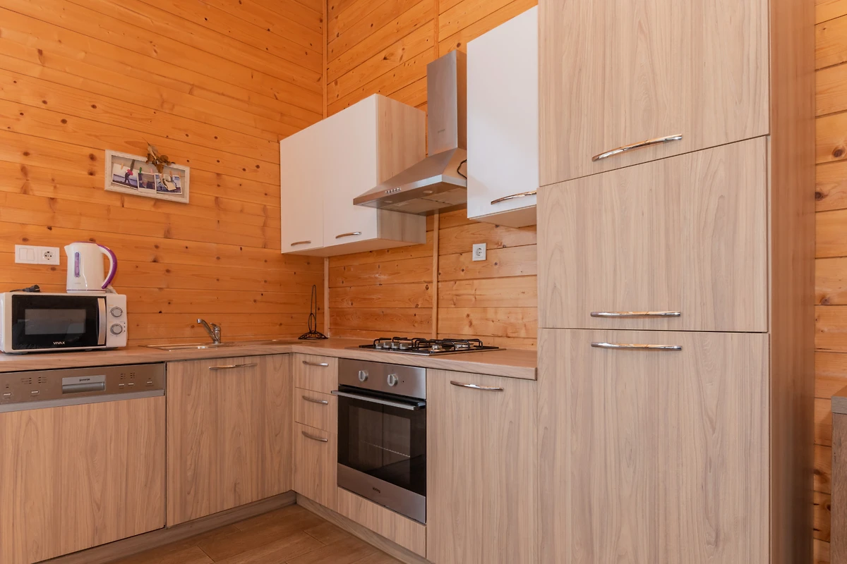 La cuisine américaine, à gaz, est équipée avec réfrigérateur, micro-ondes, four, congélateur, lave-vaisselle, vaisselle/couverts, ustensiles/cuisine, cafetière et grille pain.