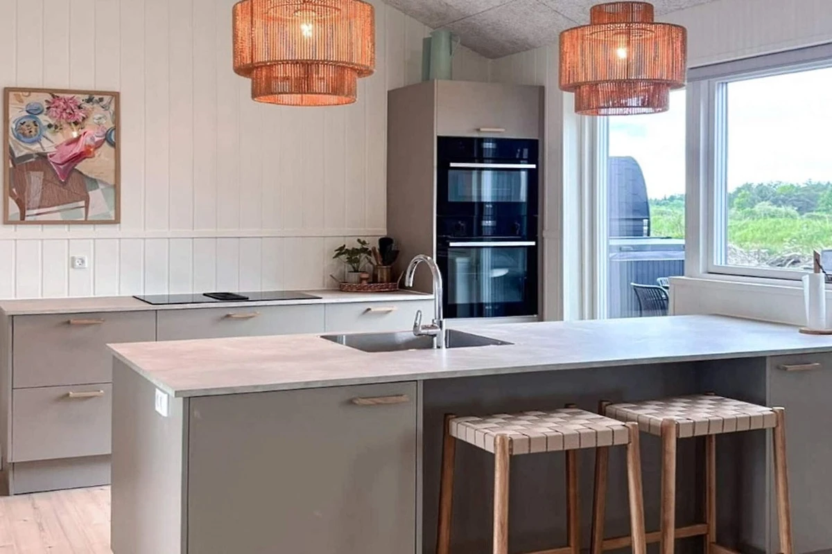 , cuisine(poêle(induction), cafetière/percolateur, four, micro ondes, lave-vaisselle , réfrigérateur, congélateur(200-249L)), living/chambre à coucher(TV(chaînes de télévision allemandes, chaînes de télévision Danoises)), chambre(lit double), chambre(lit double), chambre(lit double), chambre(lit double), chambre(2x lit simple, 2x Lit superposé), salle de bains(sèche-linge, lavabo, douche, WC, lave-linge ), salle de bains(lavabo, douche, WC), Bain à bulles(extérieur, chauffée, 8 personnes), sauna(extérieur, 8 personnes), terrasse, mobilier de jardin, chaises longues, équipements de jeux, pompe à chaleur air/air