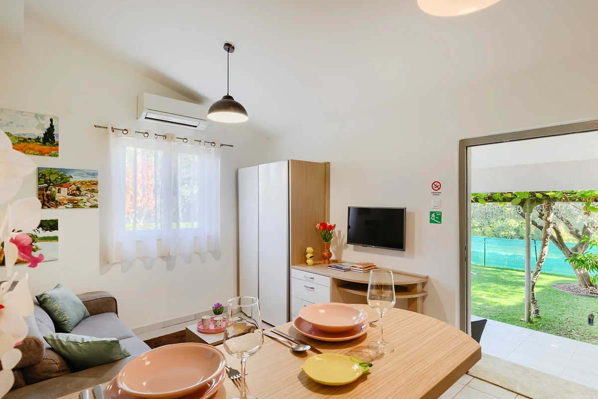 Elle dispose de jardin, clôture, terrasse, lave-linge, barbecue, fer à repasser, accès internet (wifi), sèche-cheveux, climatisation, parking extérieur même bâtiment, tv satellite.