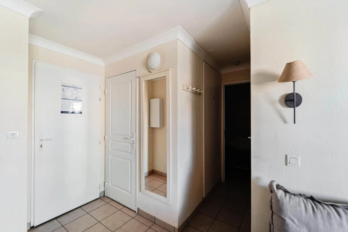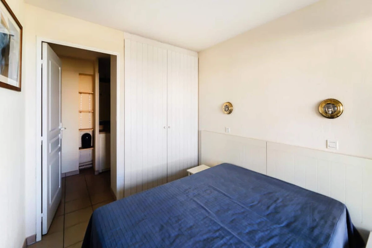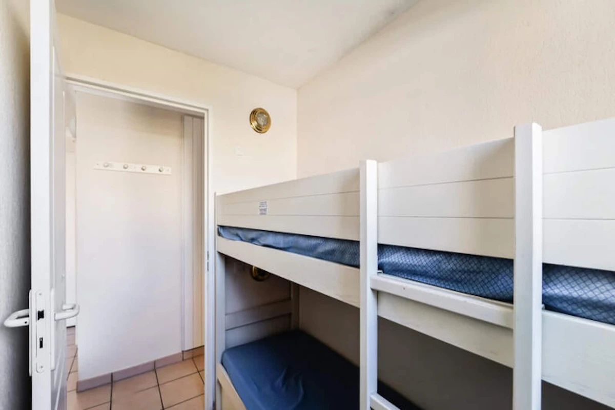 Ce charmant appartement de 35 m² est situé au premier étage d'un immeuble avec ascenseur. Il peut accueillir jusqu'à 6 personnes et comprend un séjour avec un canapé-lit et un lit gigogne ainsi que deux chambres confortables. La première chambre dispose d'un lit double, tandis que la seconde comprend deux lits simples superposés, parfaits pour les enfants. L'appartement accepte les animaux domestiques, garantissant que vos compagnons à quatre pattes peuvent vous rejoindre lors de votre escapade. De plus, un parking privé (espace n°24) est disponible pour les clients et l'appartement est doté de deux balcons meublés offrant une vue sur l'océan et la piscine.