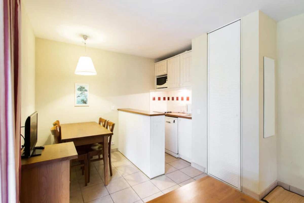 À l'intérieur, la propriété dispose d'une cuisine entièrement équipée, idéale pour préparer vos propres repas, et d'un coin repas confortable. La salle de bains comprend des équipements modernes, garantissant un séjour relaxant. Les équipements supplémentaires incluent l'accès gratuit à une piscine à proximité et un parking sur place pour votre commodité. La propriété est conçue pour offrir tout le confort de la maison pour une escapade mémorable.
