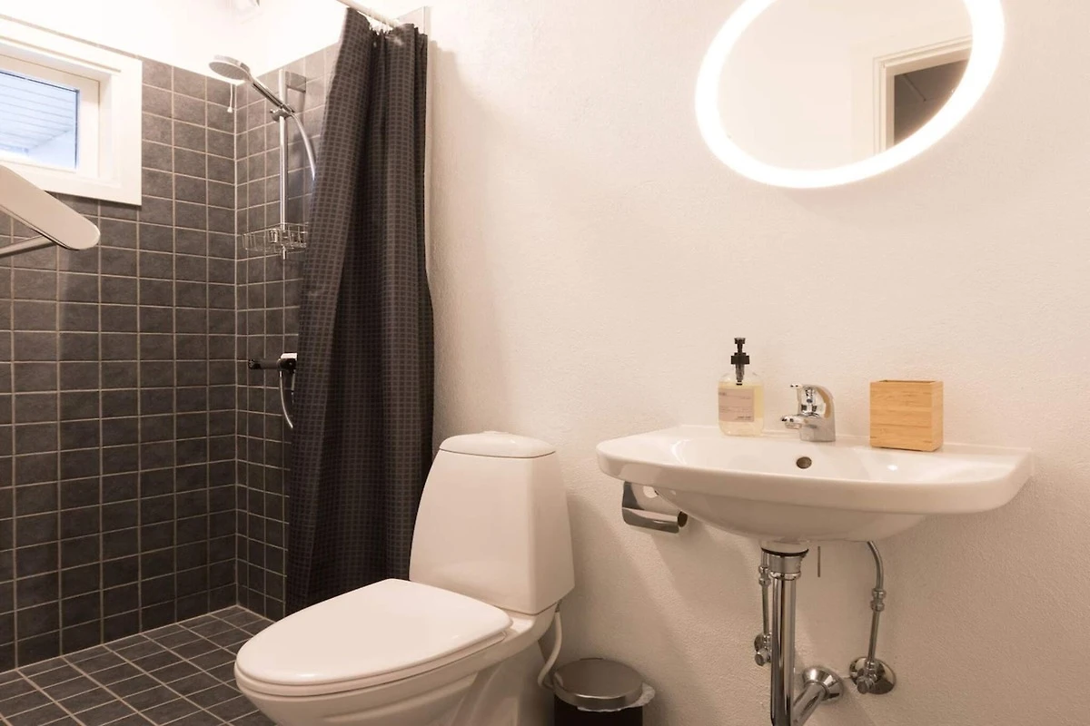 , chambre(2x lit simple, TV(chaînes de télévision Danoises)), salle de bains(lavabo, douche, WC), chauffage(central), parking