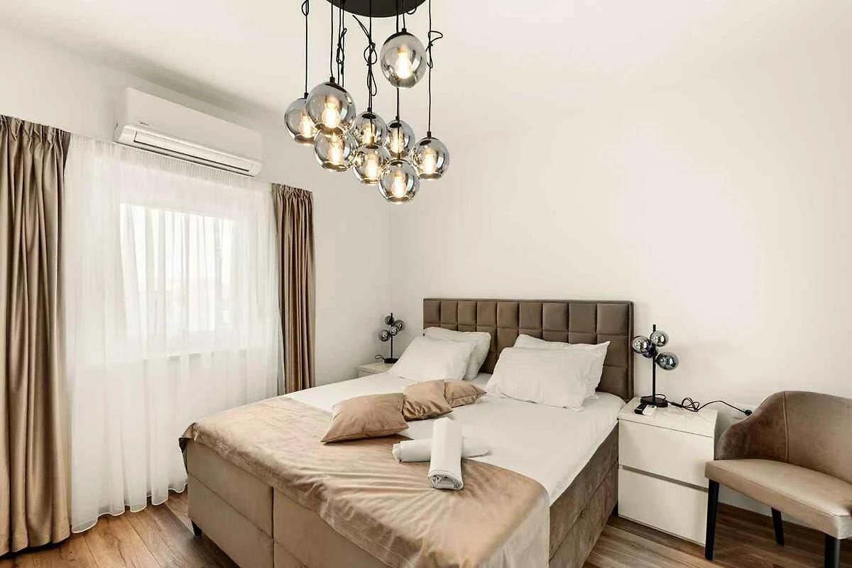 Votre maison de vacances: Votre villa a 2 étages, 4 chambres (dont 3 chambres à coucher), est de 130 m² et convenable pour un maximum de 6 personnes. Un air conditionné assure une température agréable pendant les journées chaudes. Les chambres sont réparties comme suit: 3 chambre à coucher respectivement avec 1 lit double. salon avec TV. Vous avez accès à la terrasse. cuisine avec lave-vaisselle, micro-onde, machine à café, grille-pain, bouilloire électrique et machine à laver. WC séparé avec WC. salle de bain avec douche et WC.