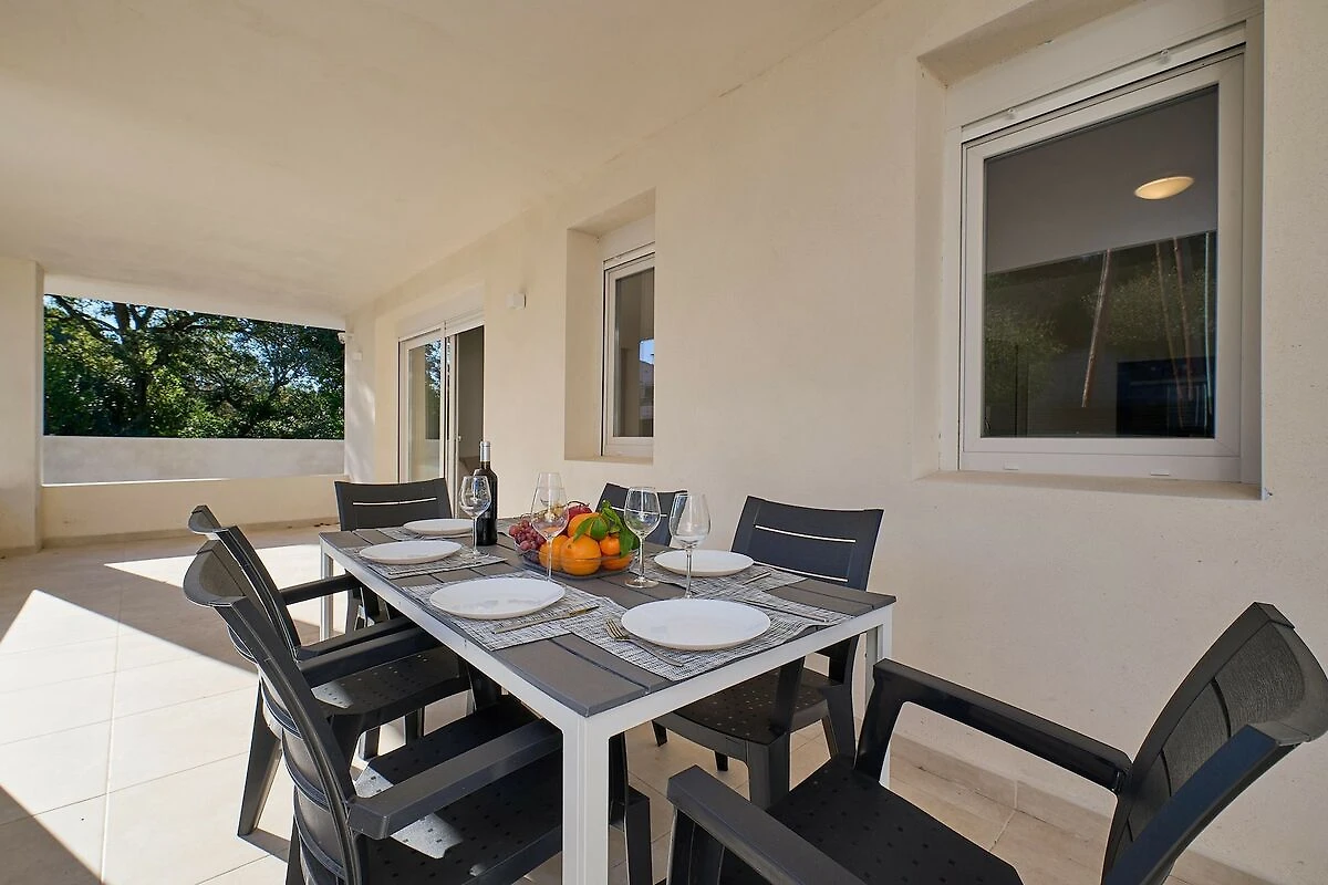 Cuisine(foyer(induction), bouilloire, grille-pain, cafetière/percolateur, four, micro ondes, lave-vaisselle , réfrigérateur, congélateur, ), salle à manger-salon(TV, table, coin salon), chambre(lit double(180 x 210 cm)), chambre(lit double(180 x 210 cm)), chambre(lit double(180 x 210 cm)), salle de bains(douche, lavabo, lavabo, WC), WC(WC), Accès Internet, Meubles de jardin, douche, lave-linge , patio, chauffage, climatisation, terrasse, jardin, transats, piscine(privé, 7 x 3 m.), fer à repasser