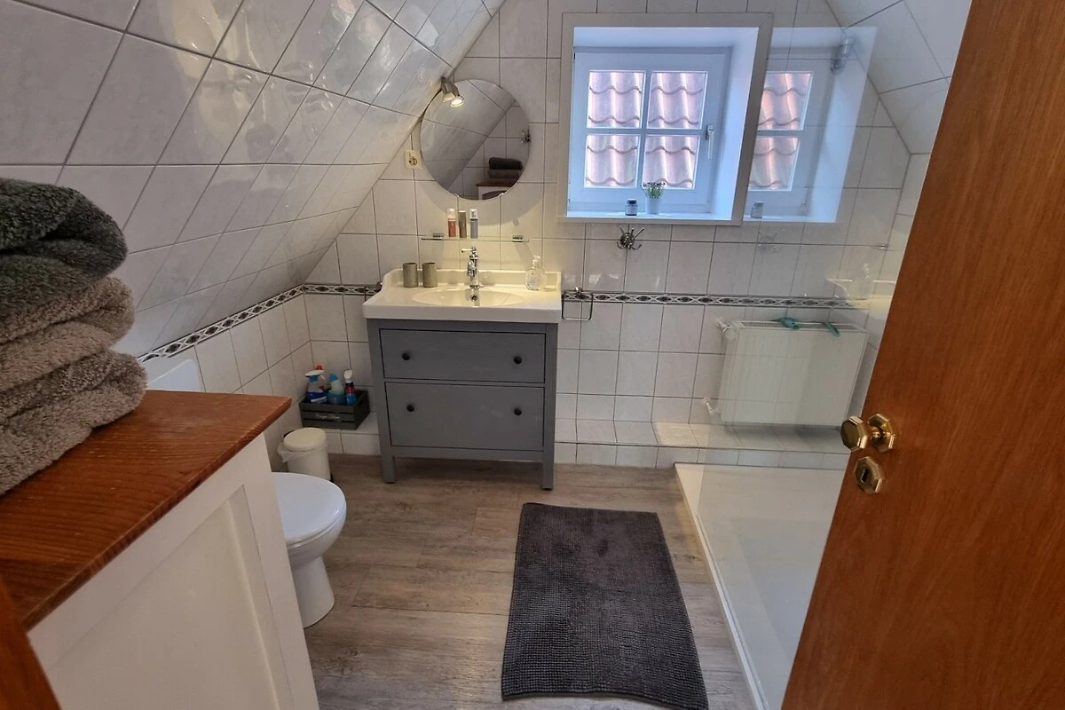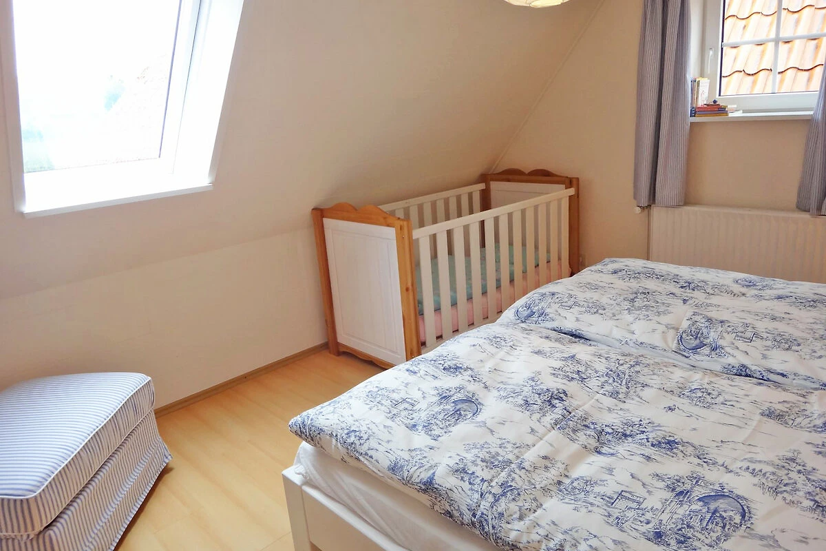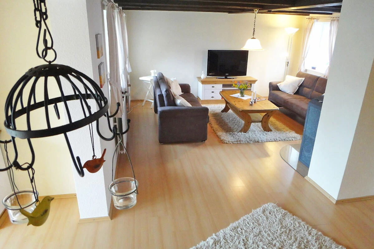 La cuisine moderne équipée d'un lave-vaisselle, d'un micro-ondes, d'un réfrigérateur, d'un congélateur, d'un grille-pain, d'une cafetière, d'une bouilloire et d'une cuisinière avec four est merveilleusement adaptée aux petits ou grands plats. Le coin repas séparé avec 6 places assises, vue sur le jardin et accès à la terrasse, invite tout autant à la détente que la partie salon confortable avec un ensemble de sièges douillets. Une grande télévision à écran plat, un DVD et une collection de livres divertissent les hôtes lorsque le temps n'est pas au beau fixe. Les poutres historiques de cette maison restaurée avec soin, les nombreux petits accessoires et le crépitement du poêle à bois créent une atmosphère de bien-être en toutes saisons. La maison de vacances dispose de deux chambres à coucher séparées à l'étage supérieur. L'une d'elles est équipée d'un lit double (2 matelas simples) et d'un lit d'enfant. L'autre chambre, située dans la romantique chambre à pignon avec vue sur le jardin, dispose de deux lits simples (90x200). La salle de bains est équipée d'une douche/WC et il y a un deuxième WC pour les invités au rez-de-chaussée.