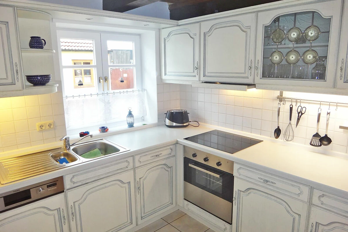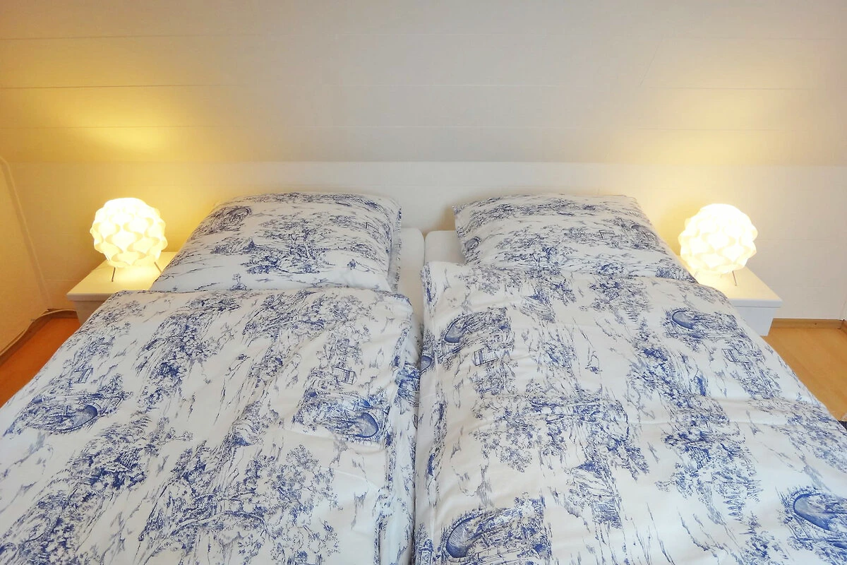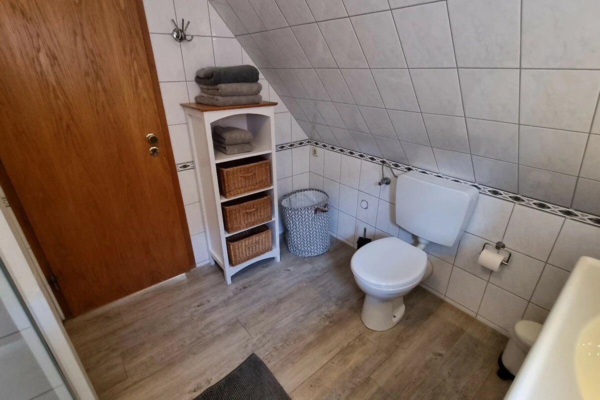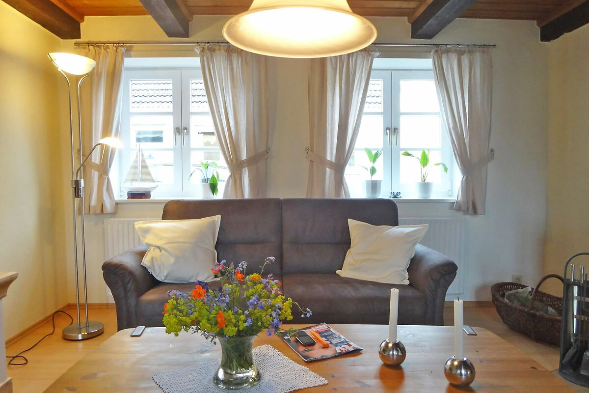 La cuisine moderne équipée d'un lave-vaisselle, d'un micro-ondes, d'un réfrigérateur, d'un congélateur, d'un grille-pain, d'une cafetière, d'une bouilloire et d'une cuisinière avec four est merveilleusement adaptée aux petits ou grands plats. Le coin repas séparé avec 6 places assises, vue sur le jardin et accès à la terrasse, invite tout autant à la détente que la partie salon confortable avec un ensemble de sièges douillets. Une grande télévision à écran plat, un DVD et une collection de livres divertissent les hôtes lorsque le temps n'est pas au beau fixe. Les poutres historiques de cette maison restaurée avec soin, les nombreux petits accessoires et le crépitement du poêle à bois créent une atmosphère de bien-être en toutes saisons. La maison de vacances dispose de deux chambres à coucher séparées à l'étage supérieur. L'une d'elles est équipée d'un lit double (2 matelas simples) et d'un lit d'enfant. L'autre chambre, située dans la romantique chambre à pignon avec vue sur le jardin, dispose de deux lits simples (90x200). La salle de bains est équipée d'une douche/WC et il y a un deuxième WC pour les invités au rez-de-chaussée.