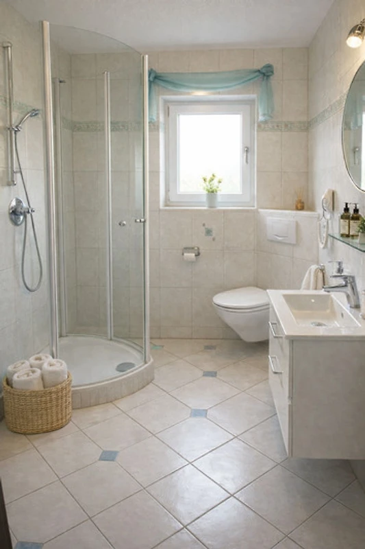 La salle de bain spacieuse avec douche, WC suspendu, urinoir, porte-serviettes, chauffage au sol et thermostat